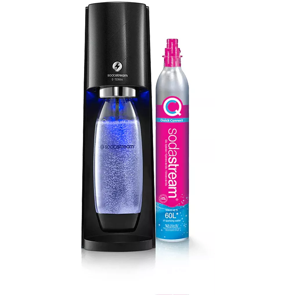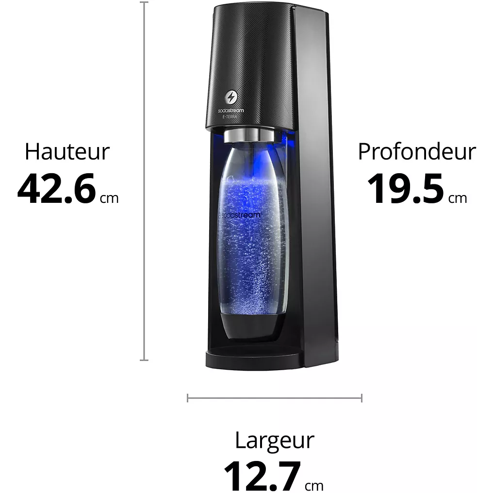 La SodaStream E-TERRA fait partie de la gamme TERRA, avec une orientation clairement familiale et quotidienne. Il s’agit d’une machine à gazéifier l’eau du robinet ou filtrée, livrée avec une bouteille d’un litre et un cylindre de CO₂, le tout dans un format compact qui trouve facilement sa place sur un plan de travail.