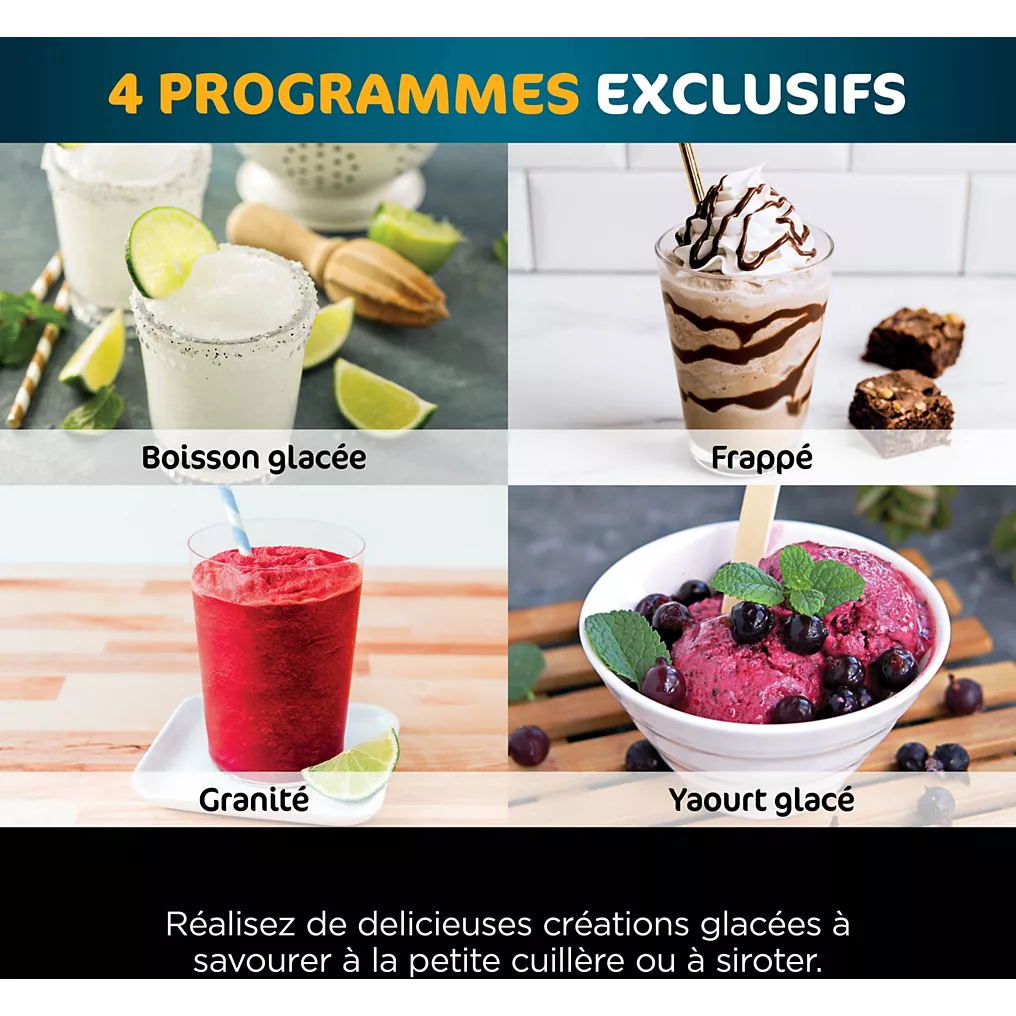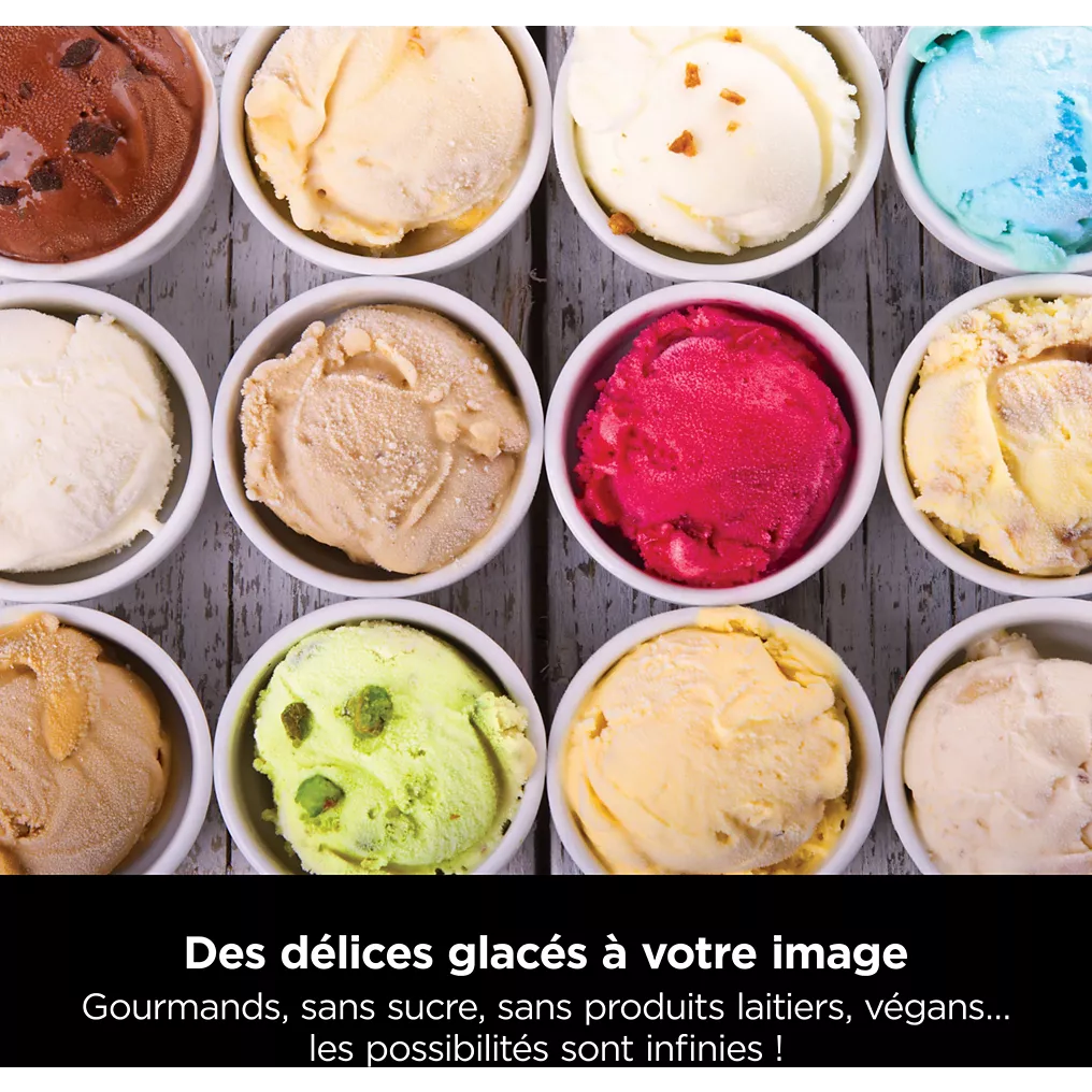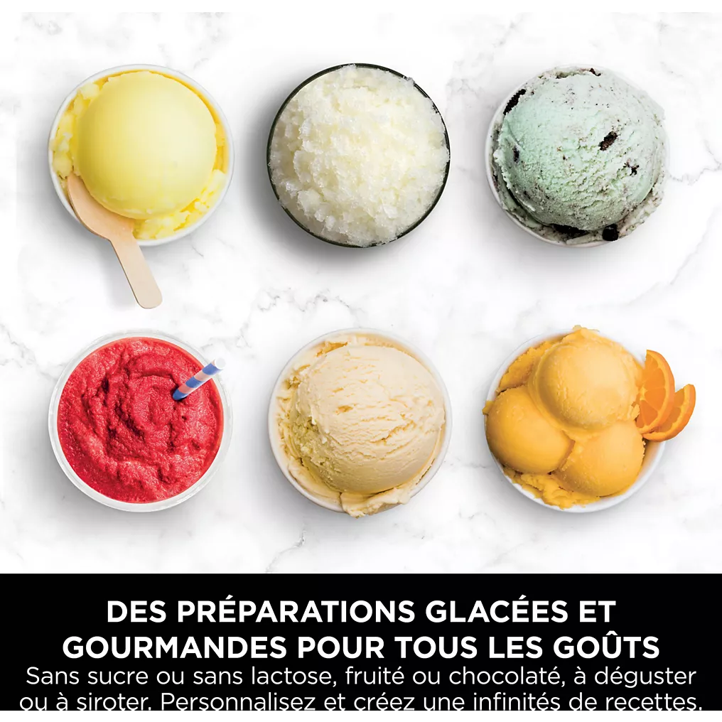 - 10 programmes automatiques : crème glacée, sorbet, granité, frappé, milkshake, yaourt glacé, glace à l’italienne, options sans sucre et sans lactose