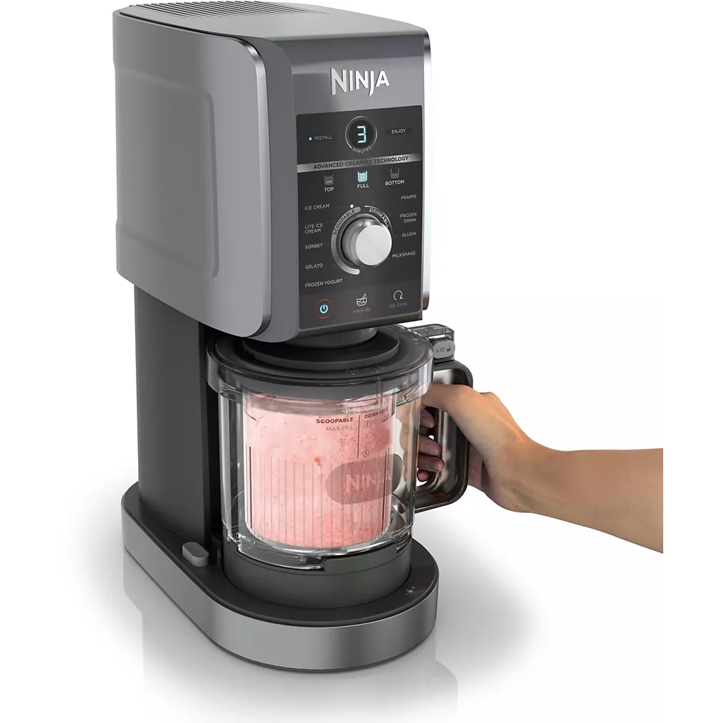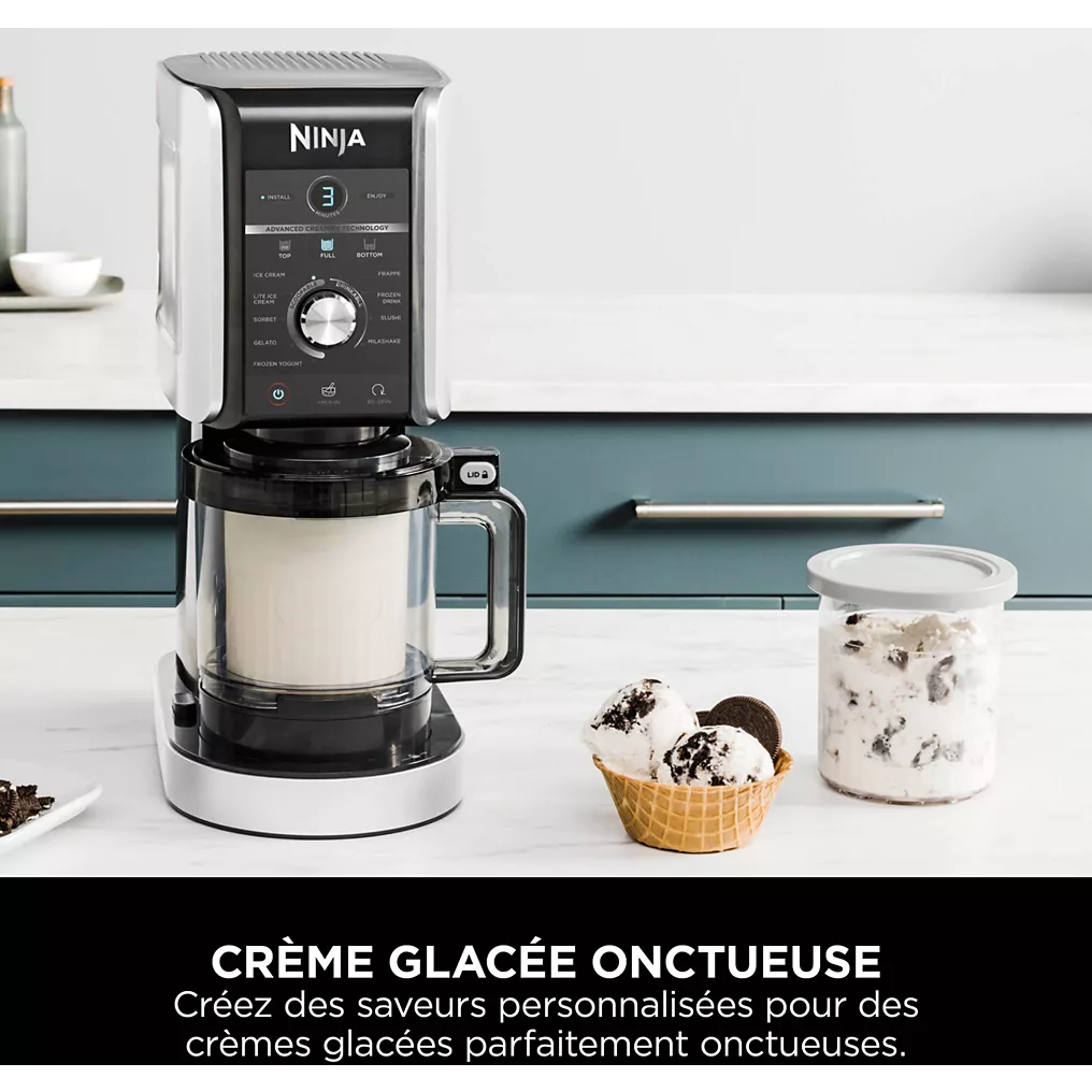 La NINJA Creami Deluxe NC501EU se distingue par une capacité totale de 2,10 litres, répartie sur trois pots de 709 ml chacun. Cette capacité supérieure à la moyenne permet de préparer plusieurs parfums simultanément ou de conserver différentes bases prêtes à l’emploi au congélateur.