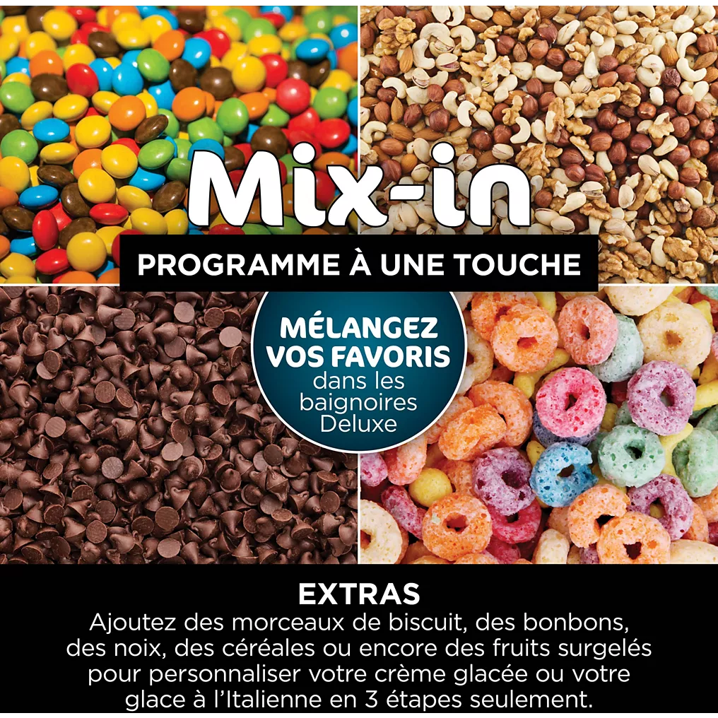 - Fonction EXTRAS pour ajouter des ingrédients en fin de préparation (pépites, fruits secs, coulis…)
